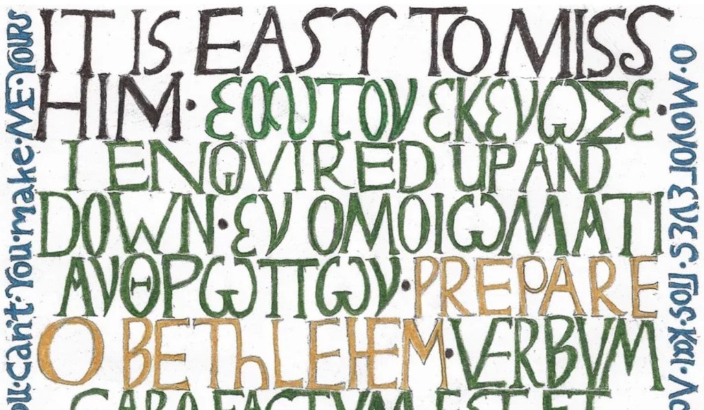 Illustration source: https://www.eighthdayinstitute.org/the-word-made-strange. The Greek phrase in the second line is “he emptied himself” from Philippians 2; the Greek in lines 3 and is “in the likeness of human beings” from the same chapter; the Greek running down the right edge says “the unique one” or “the one of a kind” or “the onlybegotten” (with an error—the masculine pronoun, but the neuter form of the adjective).