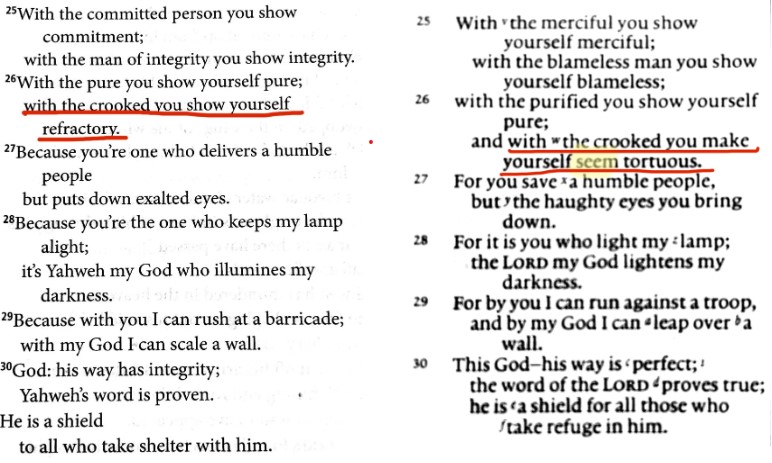 This is going a bit too far for the ESV translators, who are unwilling to run the risk that we may conclude that God is refractory, tortuous, crooked! So they throw in “seem”: “you make yourself seem tortuous.” Where did they get “seem”? Out of thin air. Or rather, out of their comprehensive theological understanding. The Bible can’t possibly say anything that isn’t exactly right, and it wouldn’t be exactly right to say that God shows himself to be tortuous, because tortuous is bad and God can’t be anything bad. Hence: “seem.”