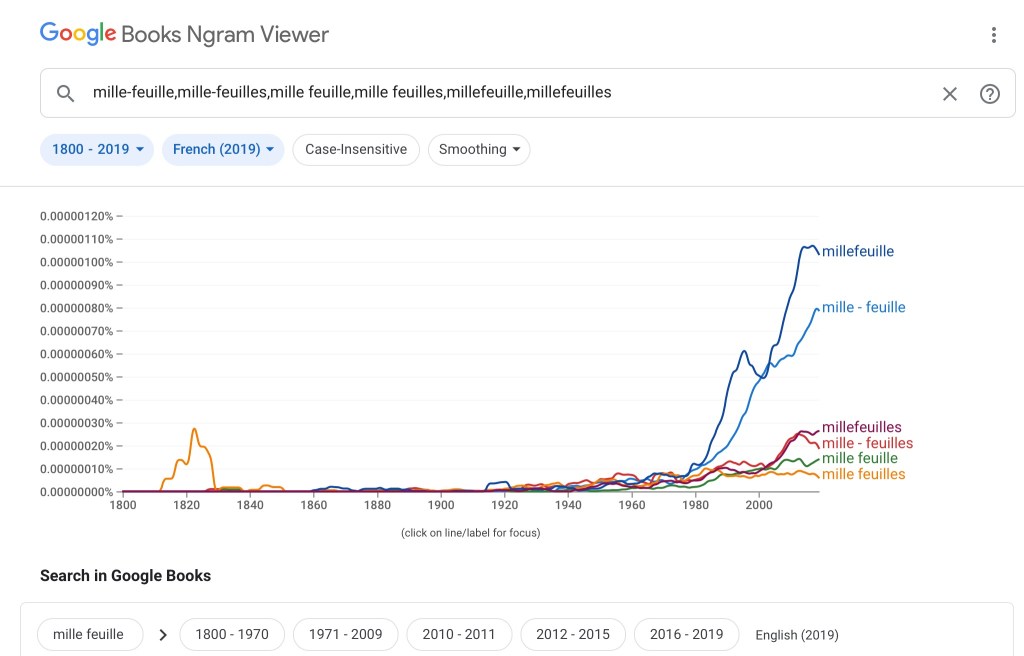 In the example depicted, I was wondering how to write the name of the French pastry called “thousand layers” or “thousand-layer” (or “leaf” rather than layer). I knew how it was pronounced, but is it written open, hyphenated, or closed? With our without the “s” to make “leaf” plural? Turns French usage is different from American-English usage.