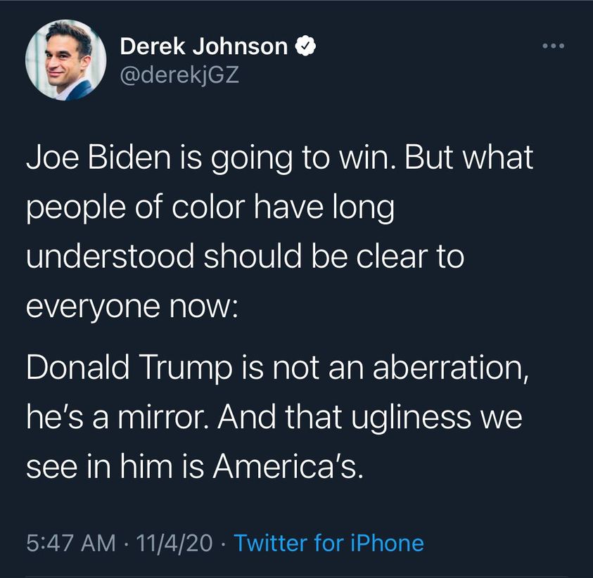 As of this moment on Friday morning, we do not yet know for sure that Joe Biden will win. But we know for sure that Donald Trump is a mirror. Others have been saying so: Andre Parry of Brookings, Eddie Glaude in an interview on MSNBC (without using the word “mirror”), Michael Gerson in his Washington Post column.