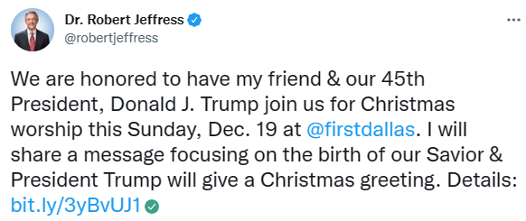 On December 16, Robert Jeffress, pastor of First Baptist Church (Dallas) and apostle of Donald Trump, posted this Tweet:
