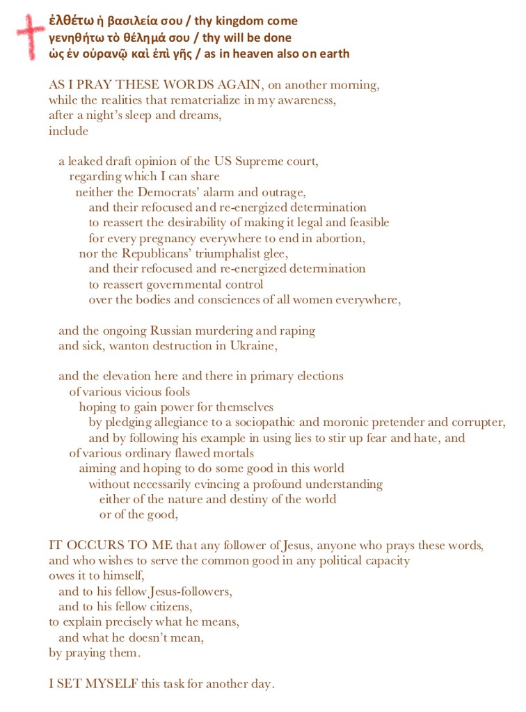 Roe v. Wade and everything else Posted byJames ErnestMay 4, 2022Posted inFaith and lifeTags:abortion, elections, Lord's Prayer, Matthew 6, Matthew 6:9-13, Roe v. Wade, theocracy, thy kingdom come, thy will be done, Trump, Trumpism Share this: Click to share on X (Opens in new window) X Click to share on Facebook (Opens in new window) Facebook Like Loading...