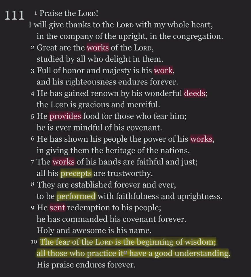Psalm 111 is a beautiful psalm of praise. It praises the character of God not as an abstraction but as manifested in God’s works. Note the recurrence of “works,” “work,” “deeds,” and various action verbs (highlighted in pink in the photo). Note also that among God’s works are God’s precepts. God not only gives foodContinue reading “All those who practice it (Psalm 111)”