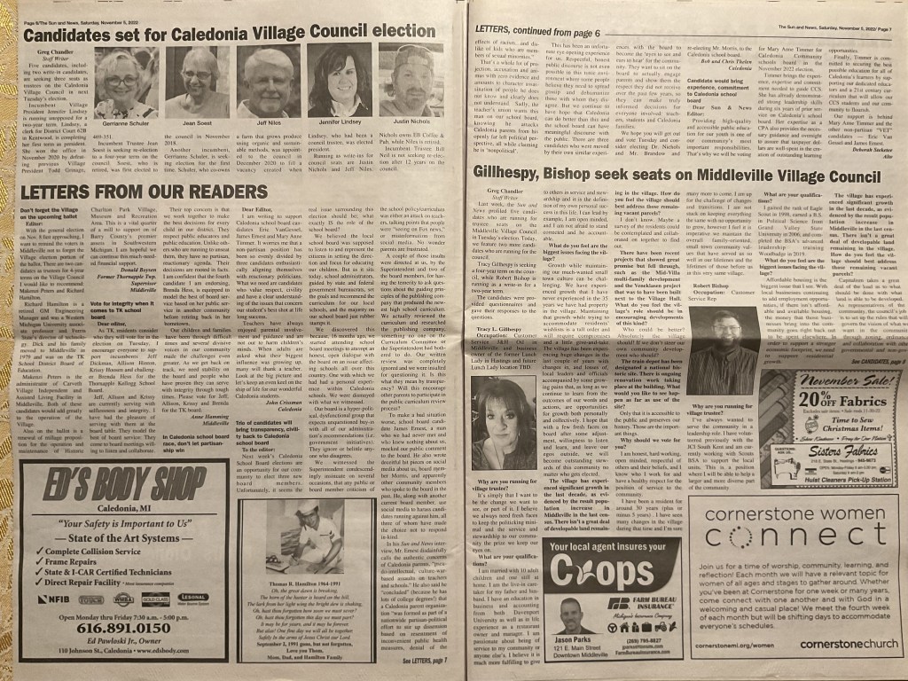 In this room in May I heard a Caledonian who wants to represent me in Lansing say our schools are full of extreme leftist ideology that promotes racism. Last month I heard another Caledonian say these textbooks are loaded with critical race theory. I regard statements like these as slurs against the character or competence, or both, of our teachers and our administrators, and against you, our school board trustees.