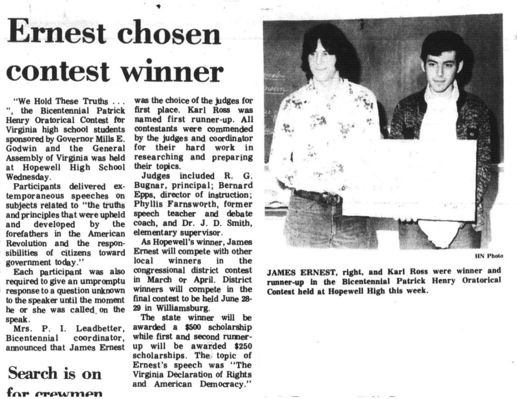 But as I was saying, I was magnetically and irresistibly drawn into the patriotic speech contests in the run-up to the bicentennial. I just dredged back into the archives of my hometown newspaper and came up with a couple of memories: