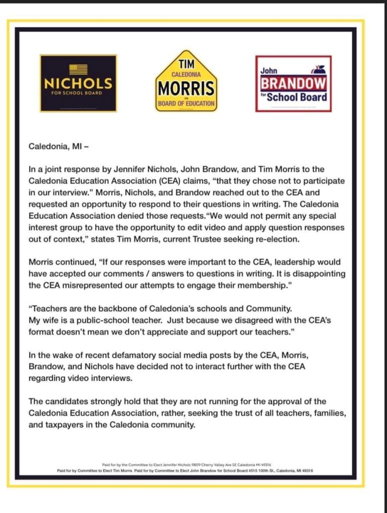 But John Brandow, Tim Morris, and Jennifer Nichols declined the invitation! This is an amazing thing, and quite a tell: why on earth would candidates who if elected are going to need to relate to teachers both as teachers and as represented by the Caledonia Education Association refuse an opportunity to speak to teachers through a recorded interview? That might cause you to suspect something about their attitude toward teachers. But they decided subsequently to remove all doubt by posting a public statement. Their public statement clarifies that they were unwilling to participate in the interviews because