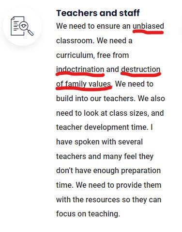 As people who are quicker than me noticed and recorded for us, John’s website, when it was under construction, originally had headers for a couple of interesting ideas that he apparently decided to drop: “Tough on Unions” was one. I don’t think that would have made a favorable impression on the CEA. Another was “No Federal Funds,” which he dropped from the website but not from his talking points. See Eric‘s FAQ for a succinct and correct response to that idea. I have screenshots of both of these that someone posted on Facebook. I think another one was “No Pride Flags.” (See above, under “destruction of family values.”) And while we’re on the topic of John’s webpage: using the minced version of a vulgar anti-Biden slogan as his URL was not exactly a wise move for someone claiming to want to keep politics out of the schools. Is this the sort of good judgment we expect in a school board member?