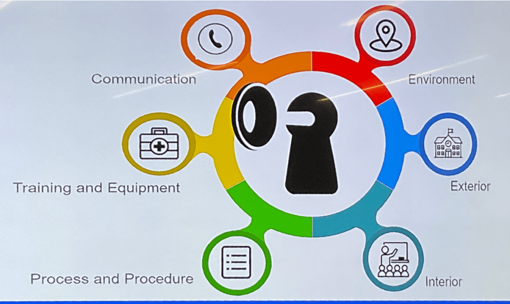 SEC works with over half the school districts in Michigan. His own background is secret service agent. Has three kids who went through Cal schools. Oldest daughter graduated 2019, will be a teacher. District leadership is fantastic. Dr. Martin, Mr. Kingsbury (unlike leaders in some districts) have always been great about asking for help. Two assessors assessed all the schools; Jason Bird and Russell himself. Looked at physical security, but also processes and procedures.
