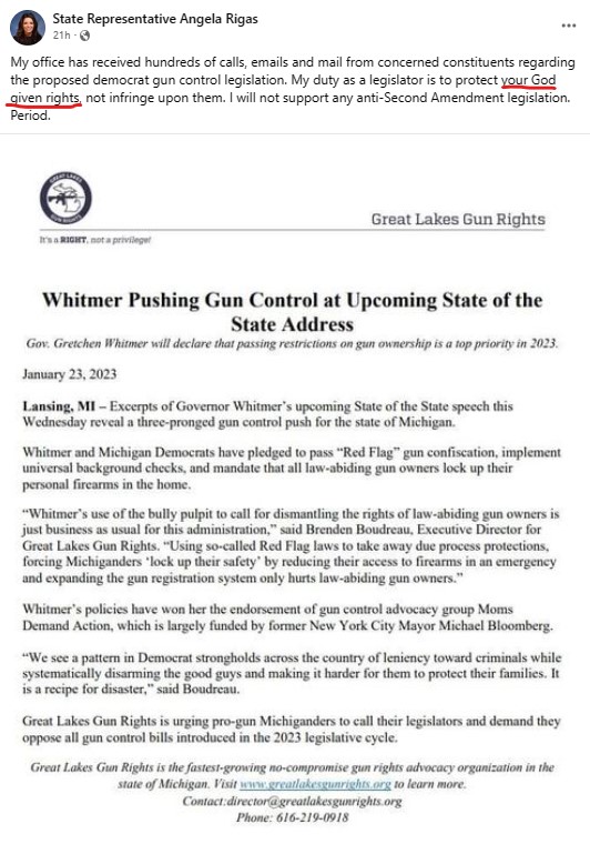 So Angela Rigas, Michigan state representative for the district in which I live, considers red-flag laws (extreme-risk protection orders), universal background checks, and requirements for safe storage of guns to be violations of the Second Amendment. Most Americans do not.