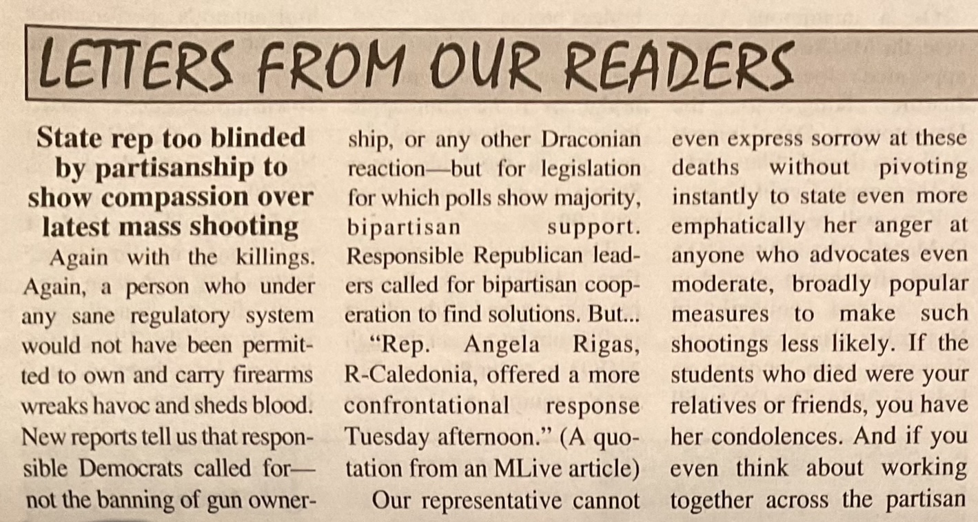 “Rep. Angela Rigas, R-Caledonia, offered a more confrontational response Tuesday afternoon.” (This is a quotation from an MLive article)