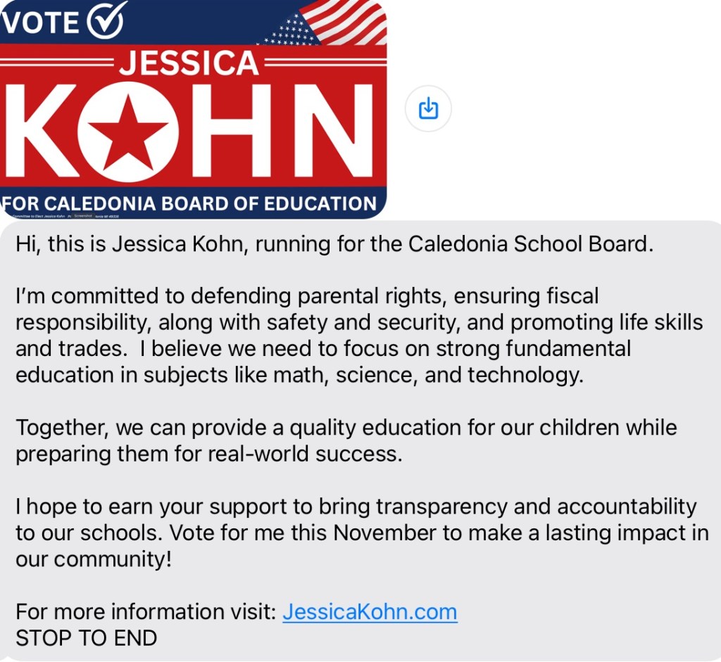 How much did it cost Jessica Kohn to spam her little campaign plug into my iMessages account? And who paid for it? But she sent it to me, and I will respond.