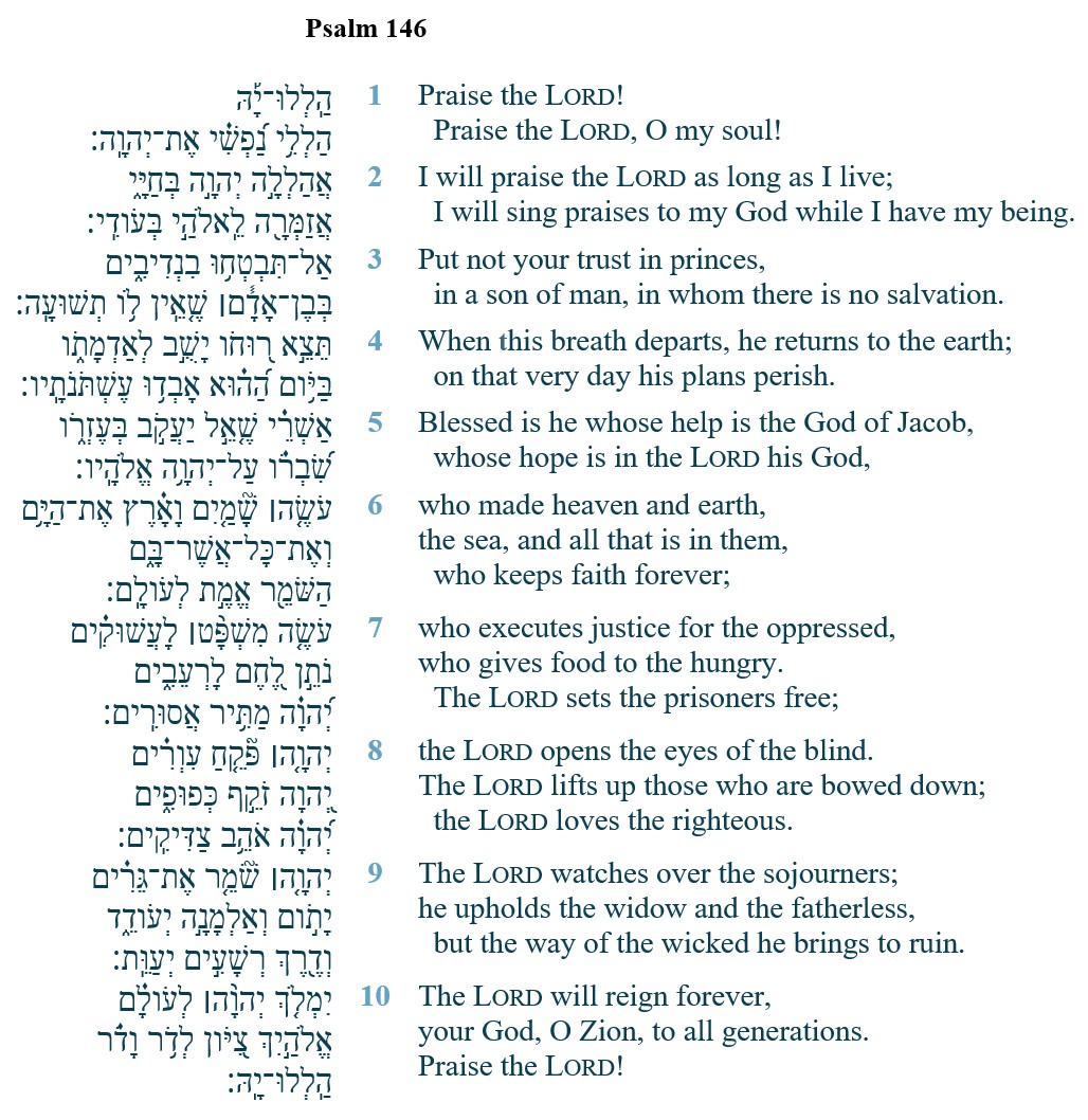 Christians who do not think that their mission as Christians entails social and political work have not read the Bible, or have read it strangely. Psalm 146, one of the great psalms of praise that conclude the Psalter begins with “Praise Yah!” It ends with “Praise Yah!” (“Yah” being a shorter form of the divineContinue reading “What the Lord does”