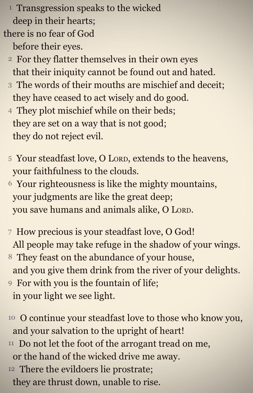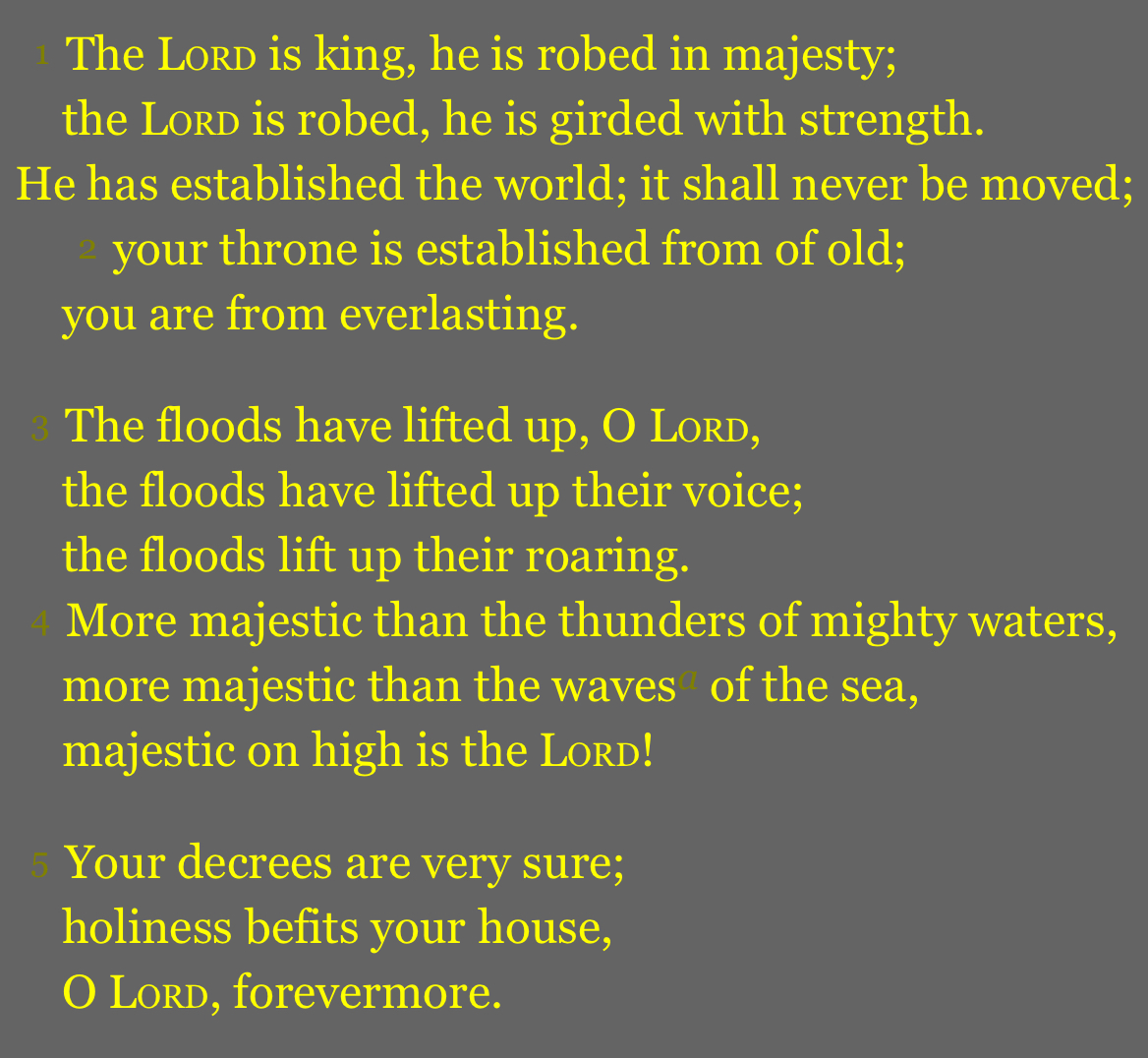 The Lord is “robed in majesty,” yes, and high and lifted up, but the scripture he has given us: it is given through our own mouths, and portrays our own plight, is right down here on the ground with us, in the mud and the blood and the gore.